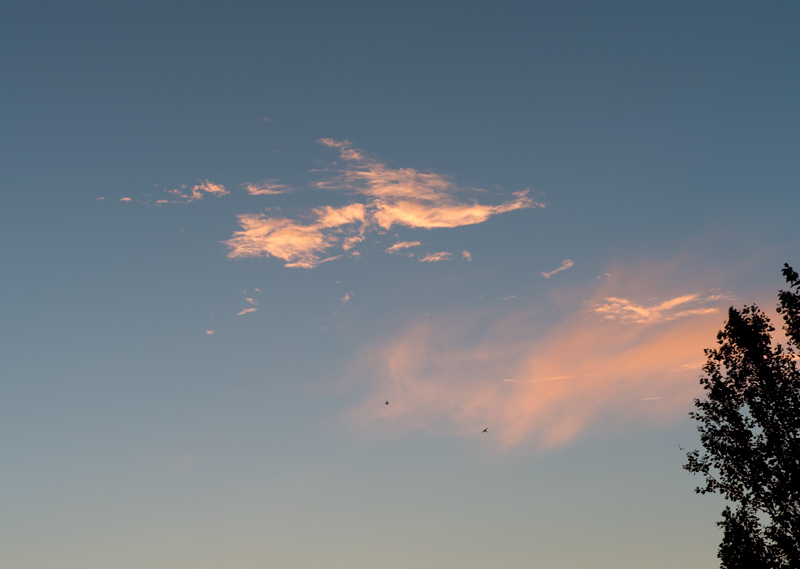 Semplice ma bella. Un brillante vuoto riempito solo di cielo, solcato da due singoli voli e poche nuvole sfrangiate. La chioma sulla destra impedisce al tutto di risolversi quasi in un astratto, e ambienta il particoalre paesaggistico respirando in questo cielo.