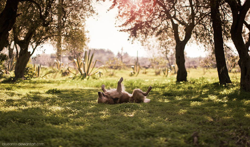 L'inquadratura è perfetta sia nel respiro ampio che è capace di cogliere la sostanza di quell'atmosfera piena di luce che permea tra i rami e sembra "calare" come una carezza di calore sul ventre del Golden, ...sia nello studiato angolo di ripresa ...basso, quasi rasoterra a consentirci di entrare dentro la scena.