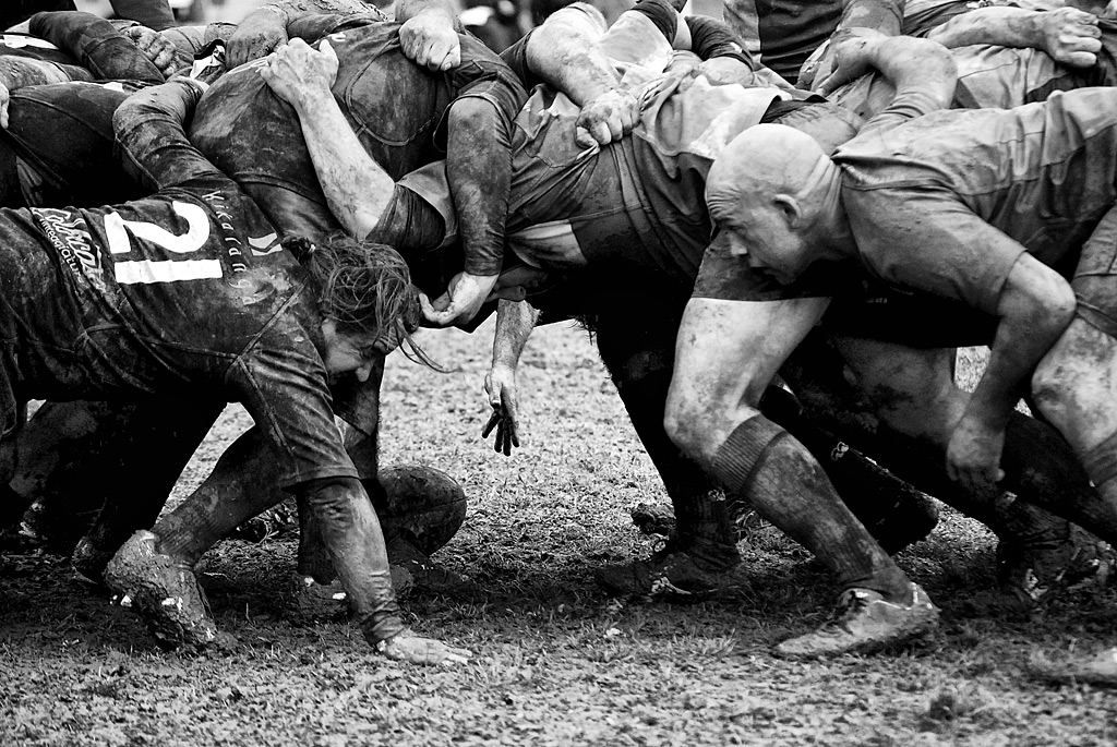 Come già detto...oltre al buon momento colto, il bianco e nero esalta come non mai questa mischia con un fango che imbratta uniformemente i giocatori di entrambe le squadre ponendoli tutti allo stesso livello d'attenzione in modo che il tutt'uno prevalga su di un singolo elemento....