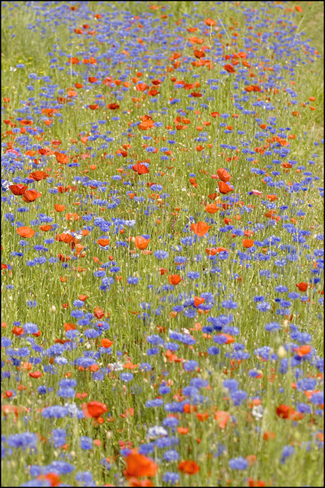 Quasi un quadro impressionista di inizio primavera. Il primo popavero più grande al bordo inferiore, esce un po' dal coro e forse io l'avrei fatto volare via con un soffio di vento... eheh
