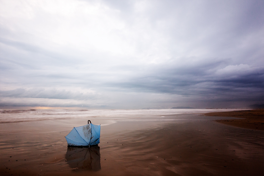 Vuoi mettere l'azzurro di questo parapioggia, e soprattutto il suo duplicarsi lucidamente in beige nella sabbia bagnata, con la sedia in plastica bianca della proposta precedente... eheh. Wink Peccato, seriamente, che qui la luminosità complessiva in alto sia molto forte, magari non completamente controbilanciabile con la patte più scura e protagonista in basso.