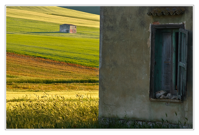 Appena un trangolino di grigio-blu, là dove termina un pendio assolato, ed a seguire troviamo un campo in ombra. Una tinta che trova un richiamo nel battente scrostato e vissuto del vecchio casolare in PP. Metà fotogramma luminoso, vitale, in rigoglio; l'altra metà in silenzio e in penombra. Presente e passato della fertilità del luogo. Dopo la matericità pettinata del campo in luce, molto bella la base fotogramma di spighe al vento in controluce.