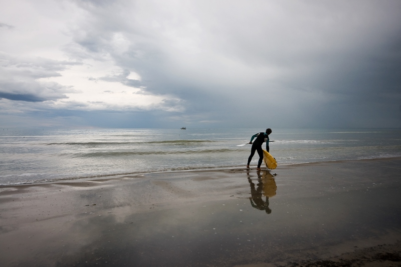 Anzitutto leverei l' imbarcazione che, per quanto piccola, annulla di fatto il senso di spazio libero e sconfinato che, in qualche modo, la foto pone come elemento sostanziale della narrazione. Fatto questo, però, ahimé, non c' è molto altro da fare: il gesto effettivamente non racconta in maniera così convincente. Tutto il sostegno alla foto è lasciato allo spazio sconfinato (per questo togliere l' imbarcazione è utile) e alla singolarità (numericamente intesa) della figura che con lo spazio si rapporta. Il taglio proposto da Giovanni ha un pregio che qui si trasforma in difetto: valorizza il surfista a discapito dello spazio; ma purtroppo (qui il difetto) il surfista non ha un gesto tale da meritare una sottolineatura e da quel taglio ciò emerge con ancor maggiore evidenza. Personalmente lascerei che lo spazio sia la cifra narrativa. Mi sono permesso di provare.