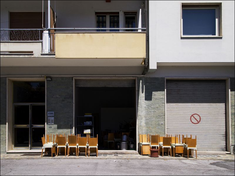Personalmente preferisco comunque che all'interno dello scatto, anche se non con una presenza fisica specifica, ci sia un'intervento umano, come in questo caso dove sono state divise e accantonate tutte queste sedie.
