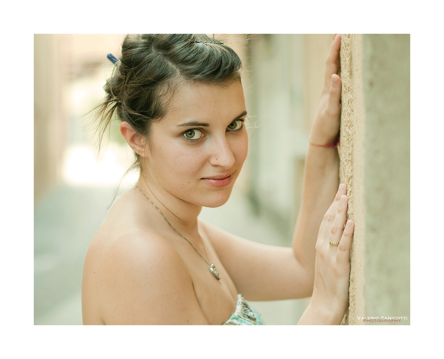Roboris, il viraggio sul giallo/verde è voluto quindi nessun errore nel bilanciamento del bianco. La foto è stata scattata in un vicoletto in ombra, quindi nessuna post produzione eccessiva, semplicemente ombre sul viso non c'erano.