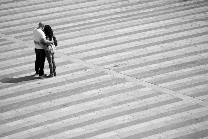 Mi piace molto la pulizia di questa fotografia ed il gioco delle linee della pavimentazione, peccato per l'ombra delle persone leggermente tagliata...