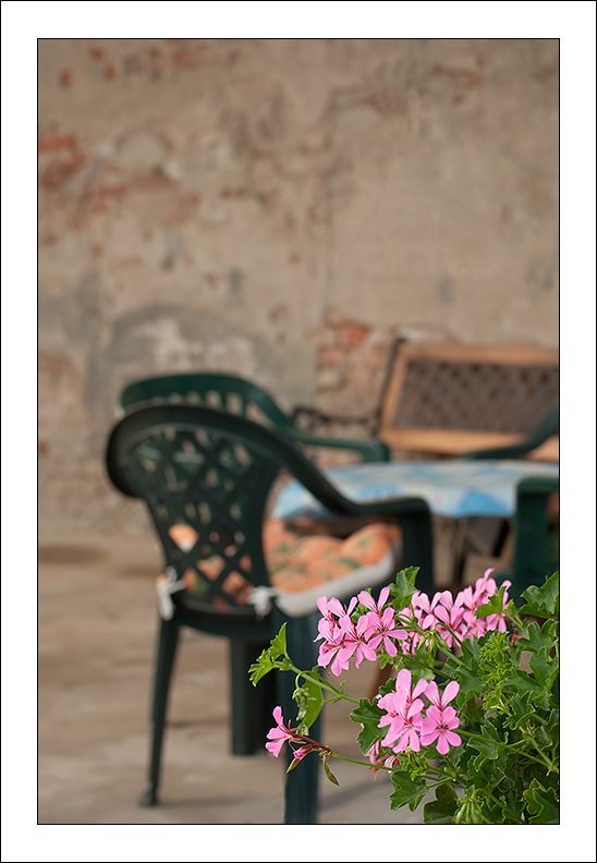 Perdonatemi se mi permetto di non condividere i pareri favorevoli espressi dagli stimatissimi Pio e Giuseppe. Coerentemente con i soggetti rappresentati e con il senso della foto (e con il riconoscibilissimo stile dell'Autore ) la delicatezza dei toni c'è ed alcuni elementi senz'altro contribuiscono a restituire la voluta atmosfera, ma l'ingombro visivo costituito dal sovrapporsi degli elementi d'arredo in plastica che fanno da sfondo a quello che si suppone essere l'elemento forte dello scatto (ossia i fiori in primo piano) a me pare eccessivo (salvo che conoscendo il posto non vi si sovrappongano altre suggestioni a mio avviso non suggerite dalla scena). Probabilmente una composizione diversamente concepita avrebbe prodotto un miglior risultato. Pareri, ovviamente, personalissimi.