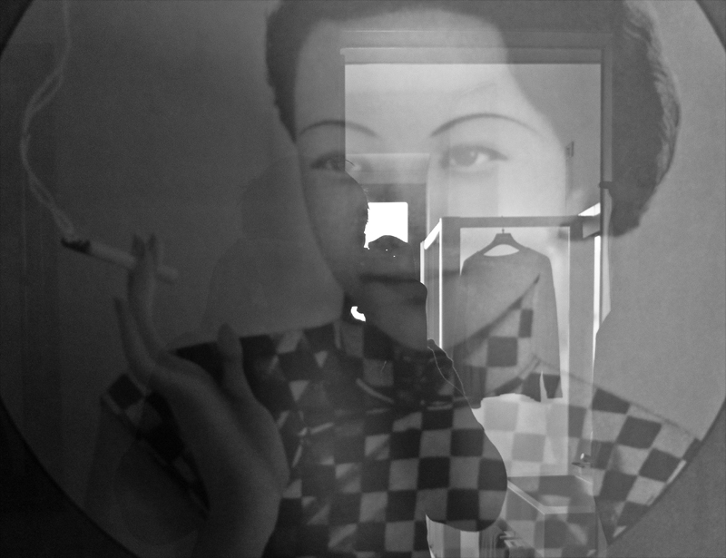 mi interessava il gioco di rimandi dei diversi piani, la fumatrice giapponese (il manifesto é una vecchia reclame di sigarette giapponese), con il riflesso del fotografo, con il riflesso di uno spazio ulteriore, un luogo domestico.