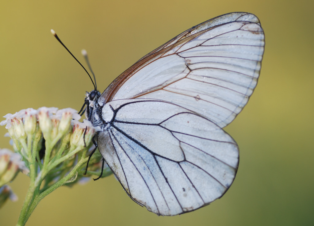 L'unica parte di questa femmina di aporia crataegi, per il marrone sull'ala dietro la testa, che vedo bene a fuoco è il bordo alare in alto al centro.