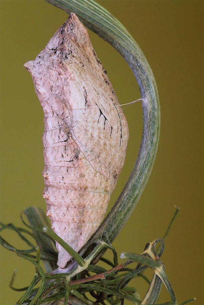La posizione scelta non è male sembra abbastanza salda e tu hai potuto fare agevolmente qualche foto ricordo. Per la resa della foto ti consiglierei sempre che tu ne abbia tempo e voglia di fare qualche scatto in più con diversi punti di maf da unire poi col focus stacking, poichè la conformazione della crisalide, molto bombata crea dei problemi alla messa a fuoco di tutto il soggetto. Quella che proponi comunque è una buona foto ben composta e abbastanza dettagliata. Ma l'emozione conta molto di più di una bellissima foto....