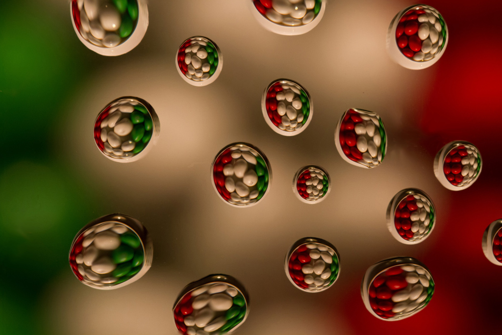 Sono "m&m's special edition" posti in una ciotola una decina di centimetri sotto ad una custodia di un cd con qualche goccia d'acqua a fare da lente.