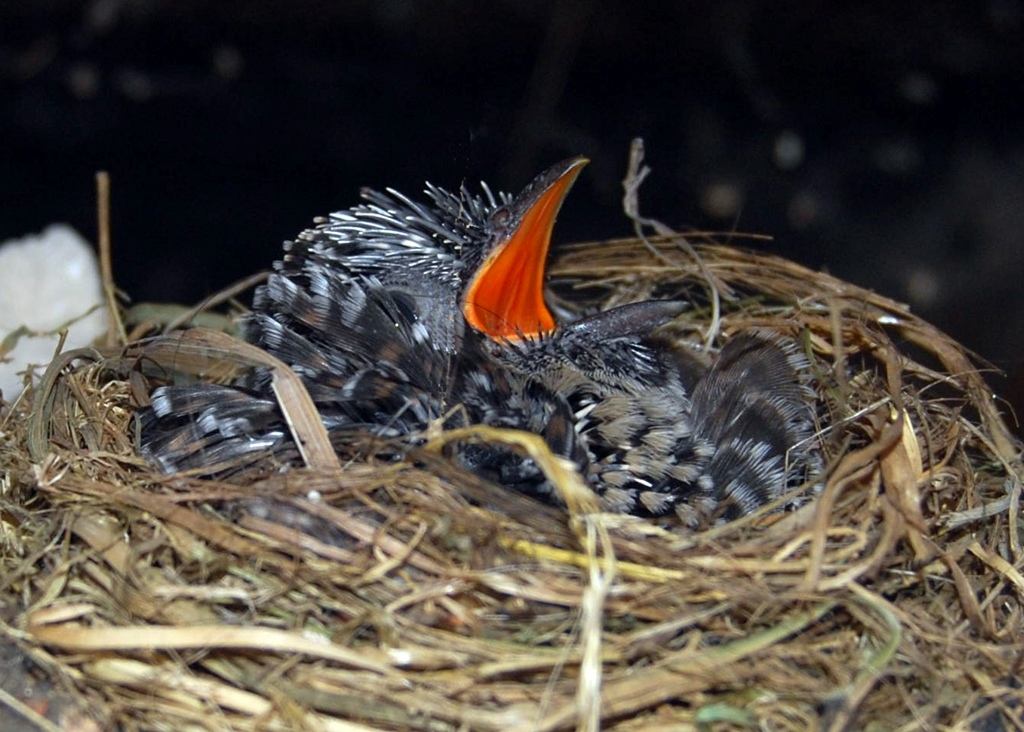 Scatto molto fortunato in una soffitta di una casa vecchia dove un cuculo ha deposto il proprio uovo e due poveri passerrottini stanno allevando questo uccello che già dopo pochi giorni è grande quanto loro (vedi le dimensioni del nido) a seguire la crescita di questo "neonato".