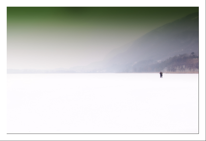 mi piace la forza elementare della composizione, quando spinge lo sguardo, da sinistra dove il bianco sovrasta, verso le due figure, sembrano ballerini che danzano sul ghiaccio.