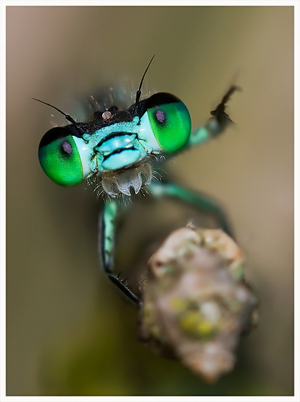 Questa invece offre la possibilità di essere apprezzata più che come macro, come immagine caricaturale addirittura, quasi un fumetto. Il volto di questo insetto è estremamente espressivo e qui assume le somiglianze, attingendo dal nostro immaginario collettivo, ad una sorta di extraterrestre che si arrampica e viene verso di noi addirittura armato (vedi quella sagoma nera che spunta da quella che dovrebbe essere a rigore una zampetta).