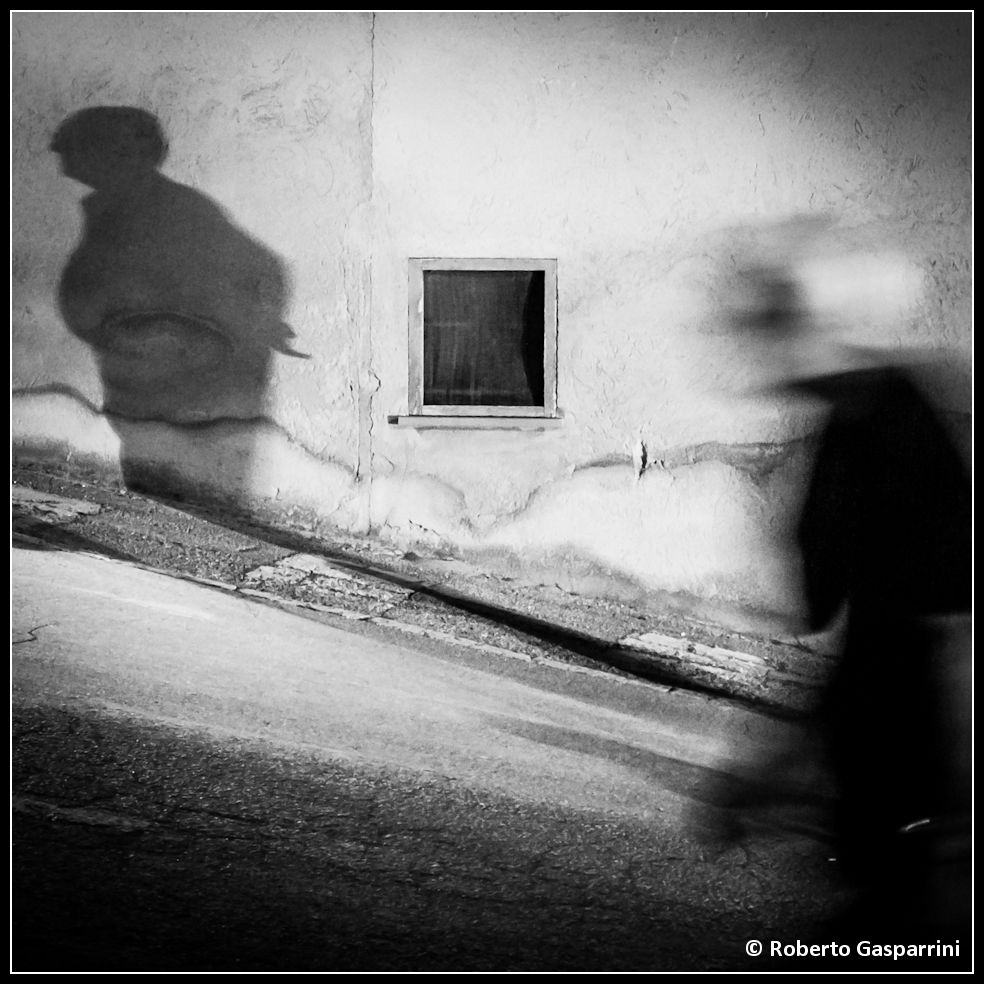 Mi piace l'impianto compositivo di questo scatto, interessanti gli elementi che lo costituiscono: l'improbabile, curioso "uccello" la cui ombra è proiettata contro il muro all'estrema sinistra, dal quale il prolungamento dell'ombra stessa ci porta alla figura in movimento che gli si contrappone nell'angolo opposto. La finestrella al centro è un punto fermo in questo mondo sbilenco (per conformazione e significati). Bel b/n per rappresentare la scena. Risultato per me onirico e suggestivo.