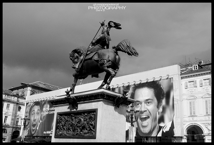 Tifoseria davvero entusiasta per Emanuele Filiberto di Savoia (quello cinquecentesco) in p.zza San Carlo! Credo cercato l'allineamento che crea una funzionale confusione dei piani. Buon b/n, morbido e completo. La composizione poteva vedere un po' più sulla destra il monumento equestre. Non capisco il titolo "fantascientifico" (a meno che non sia un errore e la foto sia di cinque anni fa!).