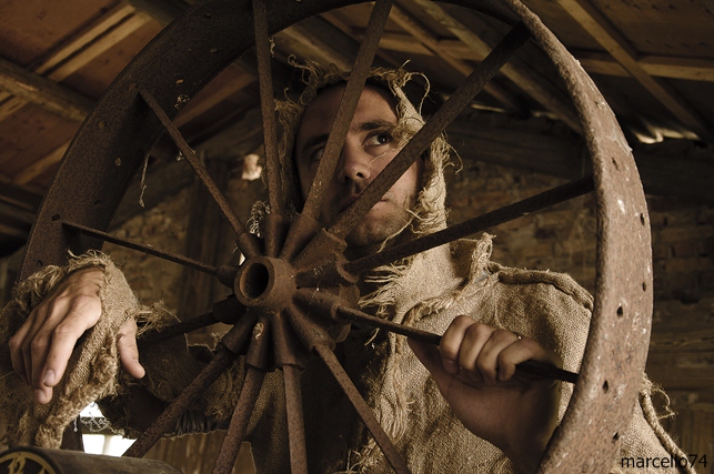 Faccio fatica a comprendere il contesto, anche se mi sembra la ricostruzione di un ambiente antico, ma non troppo, a giudicare dalla ruota che sembra di fattura abbastanza moderna.