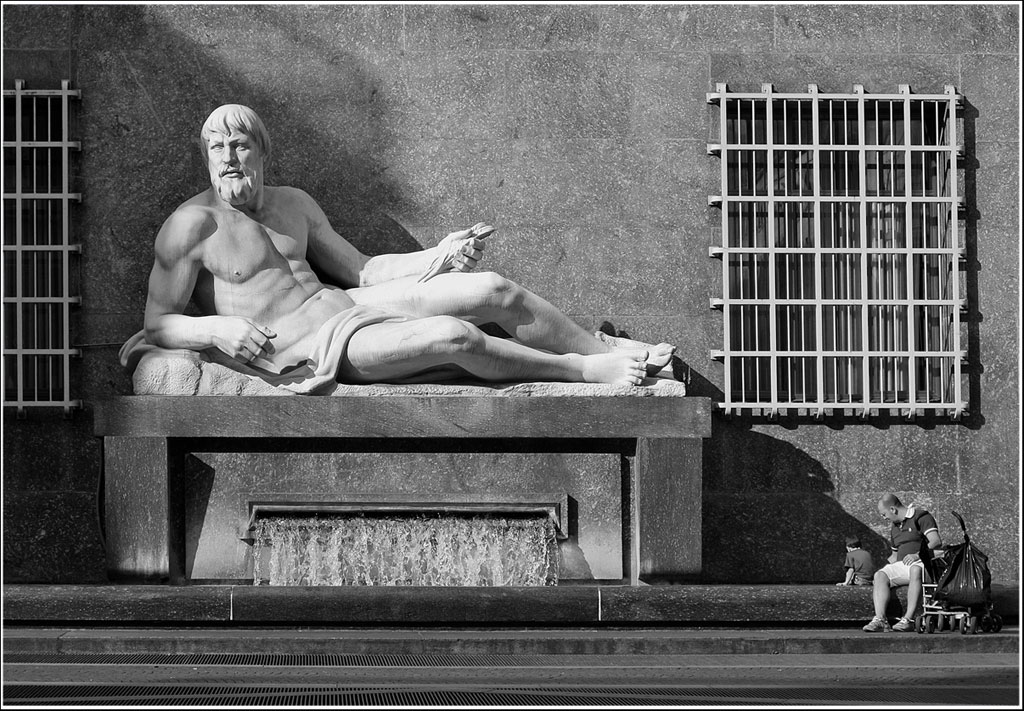 La linea della statua accentuata dalla sua ombra riconducono ai due piccoli soggetti, proporzionalmente parlando...