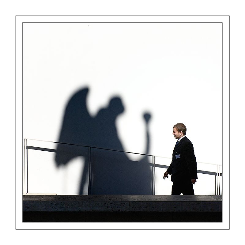 Buon colpo d'occhio. Trovo che l'efficacia sarebbe stata maggiore se la figura che passa, pur nello stesso punto, fosse stata voltata così da avere alle spalle la figura (rassicurante?, minacciosa?) dell'angelo. Ma sarebbe stato diverso, ovviamente, il senso della foto.