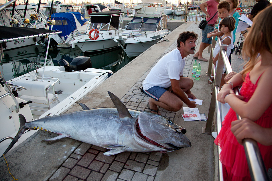 E' un tonno. Ho fatto parecchi scatti. In uno di questi si effettua la misurazione che a quanto pare è necessaria per la compilazione del verbale di "avvenuta cattura".