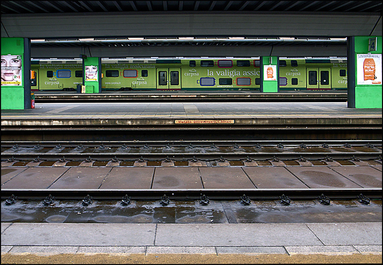 | Smarc ha scritto: | Il taglio compositivo é stato calibrato in modo tale da far coincidere coi bordi veriticali del fotogramma le strutture delle pensiline, di colore verde, a dx e sx.