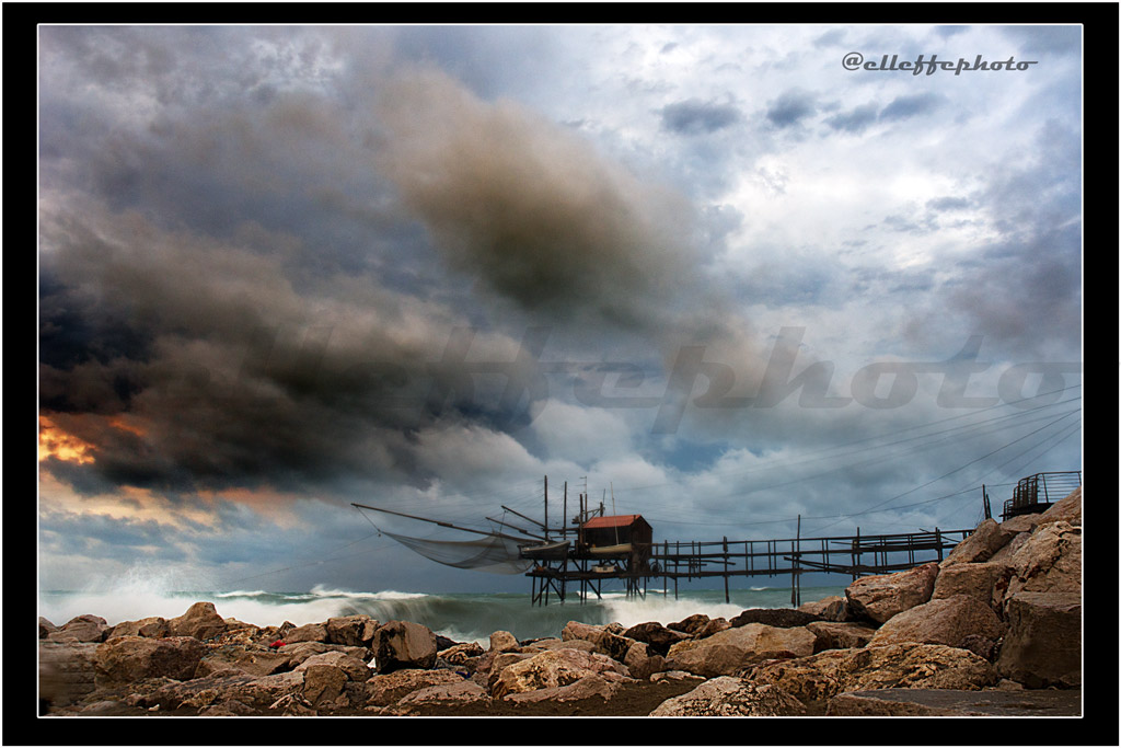 Classico scorcio marittimo con trabocco, valorizzato e reso al meglio grazie alla efficace composizione opportunamente sbilanciata verso il bellissimo cielo.