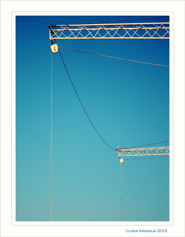 Rigore nella composizione impreziosita da tralicci e funi che noi, comuni mortali, cerchiamo spesso di evitare senza renderci conto che sono come gioielli incastonati in un cielo dalle meravigliose sfumature azzurre.