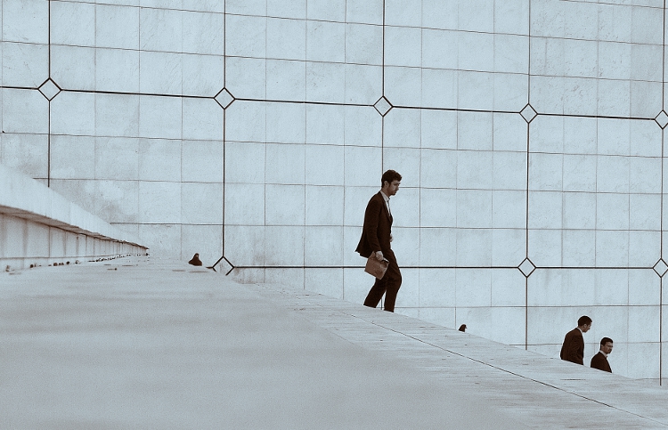 Trovo interessante l'idea di scegliere la base del gradino come punto di ripresa per avere un'inquadratura inusuale, ma di conseguenza, doveva essere un tiro al bersaglio, aspettare di essere in linea con un omino che poggiava il suo piede sul gradino, creando una sorta di fotofinish.. inserendolo anche all'interno del riquadro del muro, qui sbagli tempo..dell'omino mancano i piedi ed è trafitto dalla cornice del pannello dietro.. un peccato, perché il suo abito scuro, elegante si prestava alla grande per una scena gradevole, esteticamente valida.