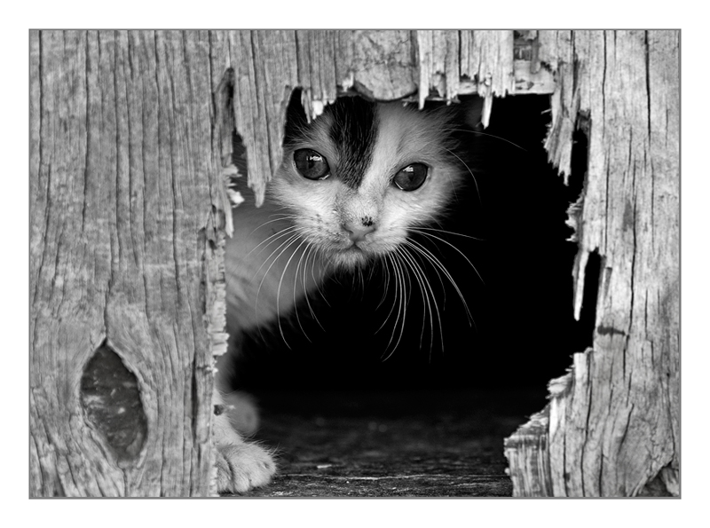 Che bello quel musetto curioso tipico dei cucciolo di gatto che esce dal buco nel legno... tenerissimo