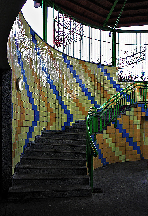 nella foto, sebbene sia intrigante il gioco cromatico delle piastrelle, mi sembra che ci siano troppi elementi di disturbo, con linee e curve che vanno e vengono...preciso che non sono assolutamente esperta di foto di architettura ( e non solo di quelle...), ma ricorre spesso nei commenti altrui di questa sezione, che una loro caratteristica debba essere la rigorosa composizione formale... non ho capito se ti interessava riprendere la scala oppure se eri maggiormente interessato al disegno del muro