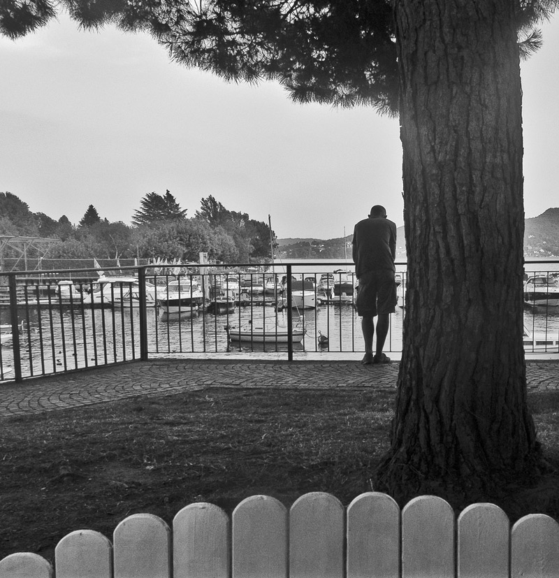Il titolo si principalmente é la staccionata bianca in primo piano, ma anche la ringhiera successiva, dove si sporge il soggetto verso il lago: in questo caso lo protegge dalla caduta o lo limita ? Perché é tra due barriere ?
