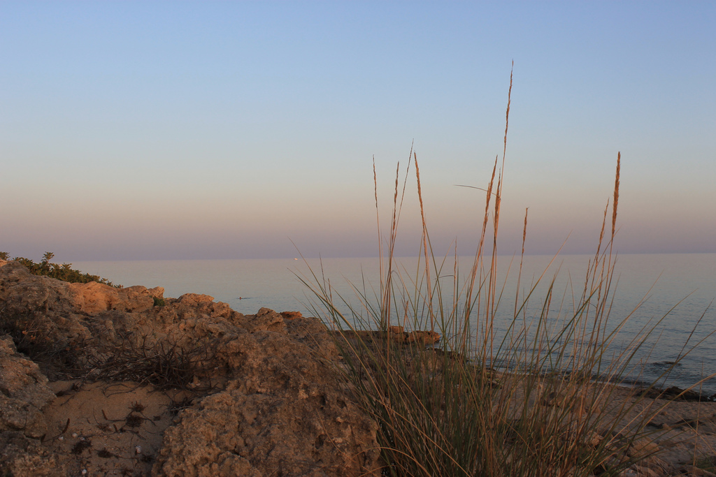 Quello che mi piace in questa immagine è la delicatezza dei colori e il contrasto, molto lieve, fra la tonalità calda delle rocce e quella tendente al viola del cielo.