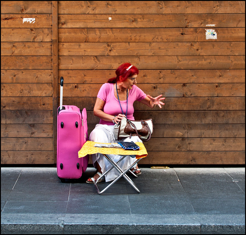 In ogni caso resta un'istantanea di un personaggio interessante, arricchita dall'accostamento cromatico valigia-maglietta. Avrei cercato di decentrare un p' il soggetto, sia verso il basso che verso sx (compatibilmente con gli elementi di disturbo). I colori mi paiono esageratamente saturi.