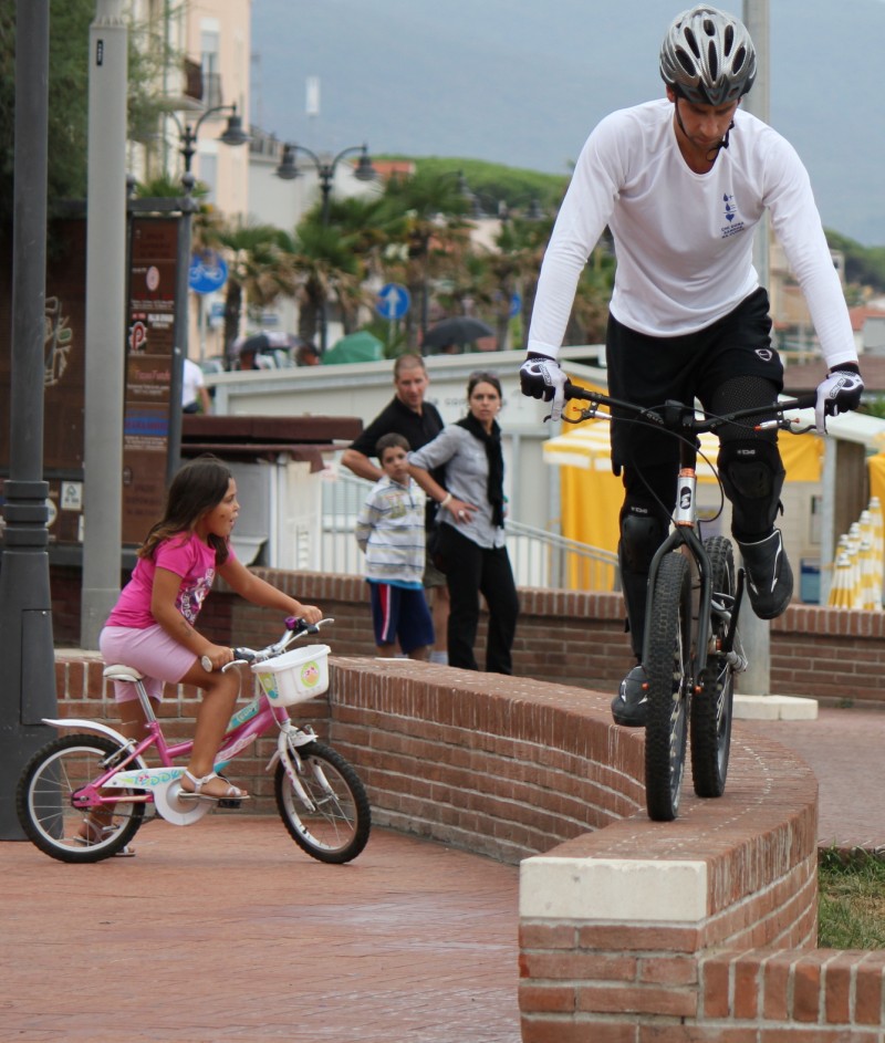 il contrasto tra un professionista che si allena e una bambina che lo insegue sulla sua biciclettina.