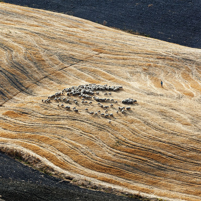 Dove hai trovato questa meravigliosa 'isola' di stoppie dai colori bruciati, immersa in un mare di terra nera? Inizialmente pensavo alle zone di Santa Luce - Orciano - Lorenzana ecc., ma il colore della terra non mi sembra quello. Veramente un'immagine di forte sapore pittorico coi solchi alternati beige e nocciola, il gregge in ottima posizione (chissà che mangiano, poverette...) e il pastore solitario che nella sua vigile immobilità sembra dirigere l'intero ventaglio delle pecore.