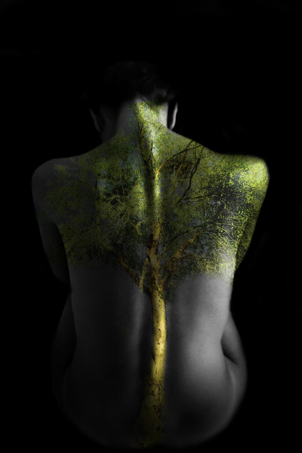 Bel dualismo quello della scelta della schiena in b/n, nutrita dalla linfa di questo albero che si articola in maniera radicata ed aggrappante. Mi piace anche il valore aggiunto del buio, del silenzio, attorno a questa rappresentazione.