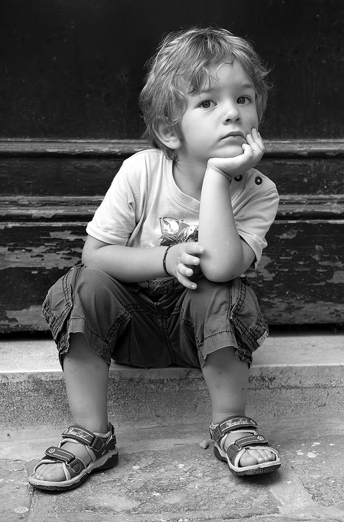 la prima cosa che mi colpisce è quella postura da piccolo uomo, da adulto tascabile che ha questo bellissimo bimbo. mi piace molto quando i bambini sono fotografati in atteggiamenti "da grandi" perchè emerge, per differenza, tutta la loro innocenza