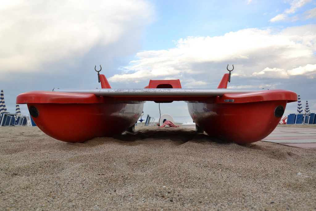 Il cielo ha una gran massa di bianchi totalmente fuori gamma, ed eliminandone una parte, avvicinando cioè il margine superiore al soggetto, si moltiplica l'effetto dato dal punto di presa basso. Basta tagliare poco al di sopra degli scalmi per rendersene conto. E a quel punto si poteva stringere il tutto e saresti rimasto con una specie di sipario tra i due scafi (che se si fosse aperto su una scena più interessante sarebbe stato meglio).