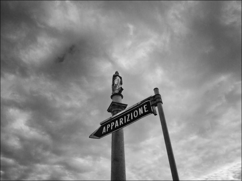 Non saprei quanto fattibile, ma se avessi trovato un punto di ripresa in maniera tale da indicare la statua con la freccia del cartello, il racconto fotografico non avrebbe avuto alcuna stonatura.