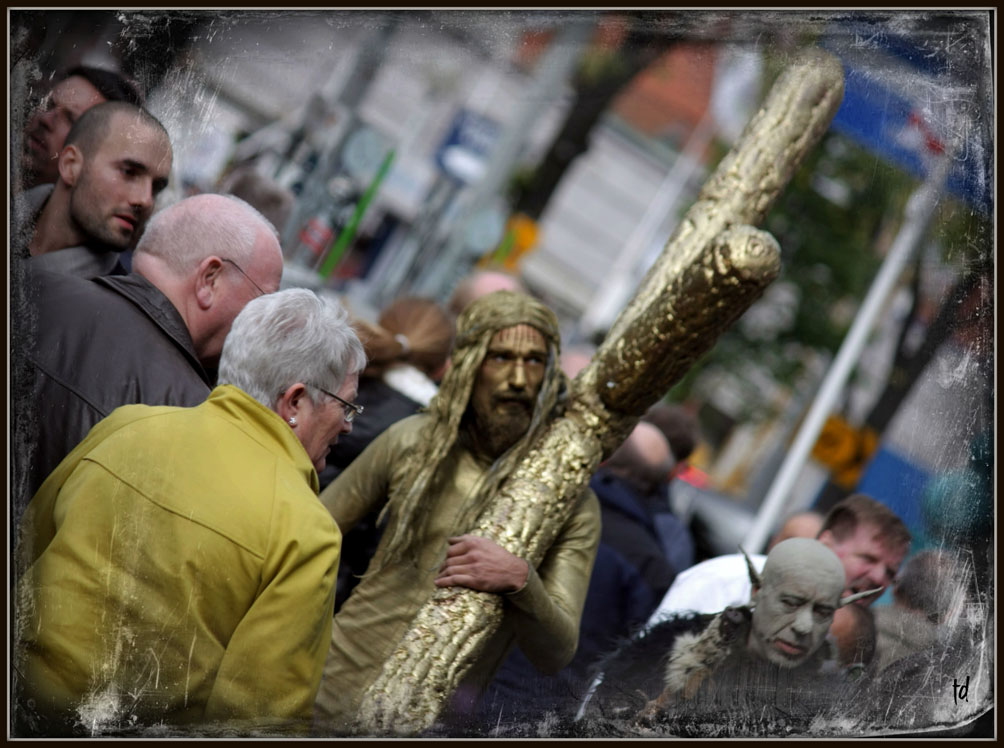 Due curiosi personaggi si mescolano tra la folla, destando lo stupore dei passanti: credo che avrei cercato di raccogliere qualche espressione più incisiva.