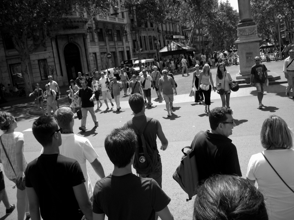 In questo fronteggiarsi di due eserciti contrapposti si intravede la foto riuscita, che viene poi secondo me meno un po' a causa della ripresa sbilenca ma soprattutto per l'indebolimento dell'effetto prodotto da quel signore in basso a destra con lo zainetto rivolto di profilo a parlare anziché con un atteggiamento omogeneo al resto della sua "squadra".