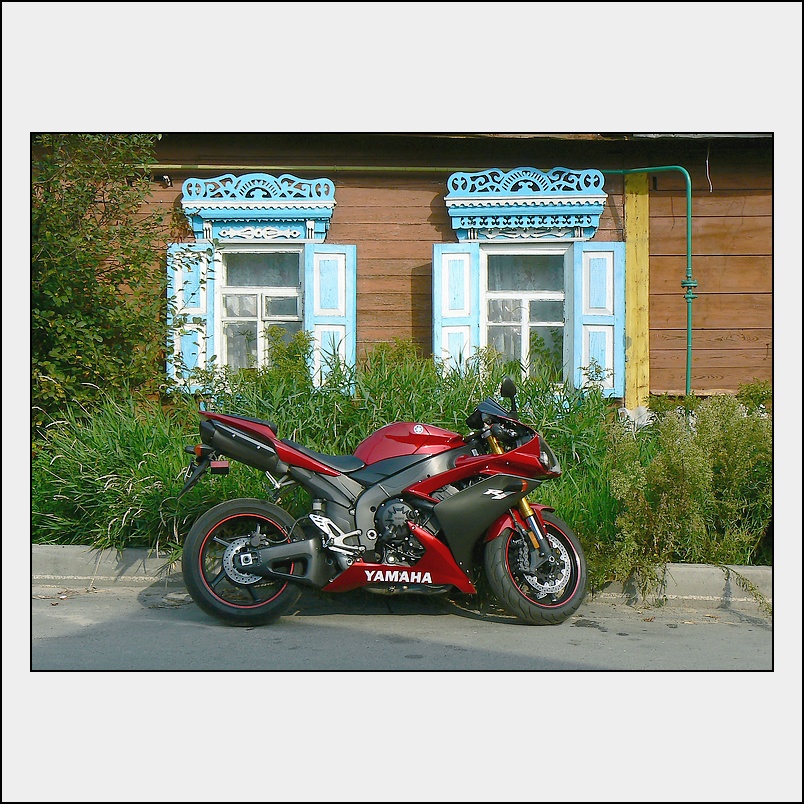 Ho voluto documentare fotograficamente il contrasto fra le tipiche finestre della vecchia casa bielorussa con la moderna motocicletta sportiva.