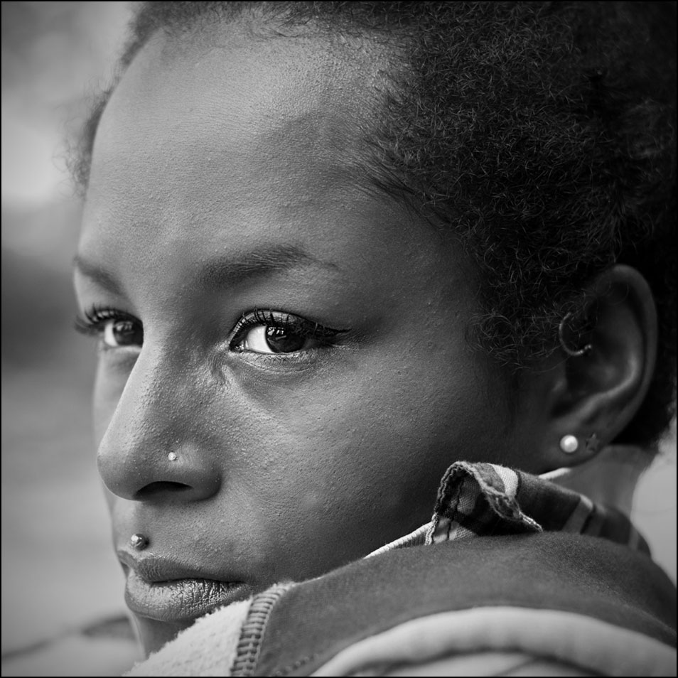 Avrei generosamente allargato l'inquadratura a sinistra ed in basso, anche per cogliere con maggiore decisione la rotazione del viso sulla spalla che occupa il primo piano della scena.