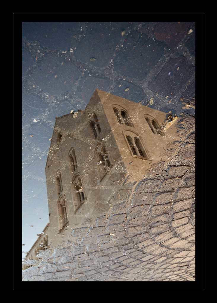 Bella prova d' interpretazione diversa e personale di un paesaggio cittadino attraverso il suo riflesso in una pozzanghera. Interessante la pavimentazione regolare per 2/3 dell'immagine e a curvatura nel restante terzo che guida l'osservazione verso il riflesso della basilica.