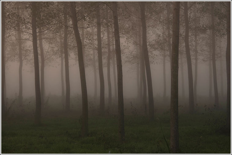 entrare in un pioppeto dalle nostre parti (pianura padana), in questa stagione di lievi nebbie che avvolgono le cose e ne attenuano la consistenza, è una magia unica, spersonalizzante e malinconica. In questo scatto hai saputo cogliere questa atmosfera con la tua consueta sensibilità e maestria.