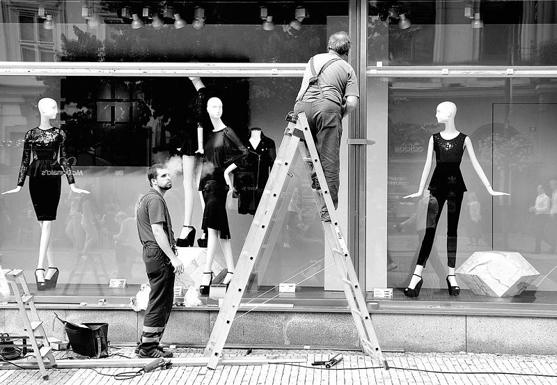 In questa foto non ci vedo nulla di particolarmente interessante, ma neppure di particolarmente...disdicevole. C'è in più, rispetto alla semplice ripresa della vetrina, la presenza dei due operai, senza andare a cercare significati particolari, tipo lo "sguardo" del manichino, che del resto si nota poco per la scarsa nitidezza e che, penso, al quale neppure tu avrai pensato al momento dello scatto. Secondo me, le foto di vetrine possono venire "impreziosite" da riflessi particolari, colori e da eventuali presenze umane (che però spesso finiscono per essere, volutamente o no, il soggetto principale cui la vetrina fa da sfondo o contrasto: es il mendicante stesso per terra davanti ad una boutique alla moda). Ci sono poi le foto di vetrine particolarmente "belle, originali e curiose", ma qui il merito va diviso almeno al 50% fra la professionalità del vetrinista e l'abilità del fotografo nel "vedere" e riprodurre quanto vede. Sto parlando da...cultore della materia, però... facendo un sacco di chiacchiere! Allora parliamo della tua foto. Di questa mi hanno colpito negativamente, in particolare, una notevole sovraesposizione con troppi bianchi bruciati e una insufficiente nitidezza e ciò non me la fa molto gradire. Poco leggibili i riflessi. Per il soggetto credo di aver detto abbastanza. Ciao Smile