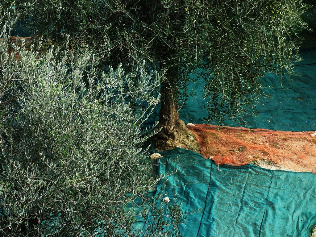 Mi piace questa inconsueta inquadratura dall’alto e trovo bellissimo il contrasto di colore tra i teli stesi a terra per la raccolta.