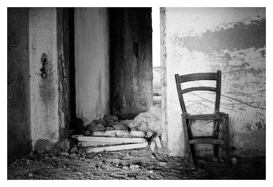 L'occhio si dirige istantaneamente sulla sedia elemento essenziale di questo scenario di abbandono. Un oggetto che ha sostenuto il peso dando sollievo e ora cede sotto il peso del tempo. Un 'immagine con poche cose, ma capace di far riflettere. L'abbandono è il peso più duro da sostenere. Complimenti Nicola.