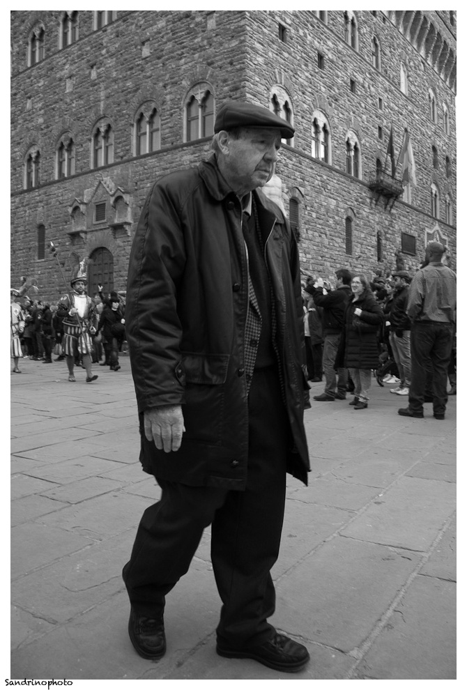 Da notare come il soggetto sia stato messo efficacemente in risalto, con un effetto di tridimensionalitá, grazie al punto di ripresa ed al suo posizionamento in corrispondenza dello spigolo del palazzo in prospettiva. Abbigliamento, postura ed espressione dimessa caratterizzano il soggetto quanto basta perche risulti un personaggio fotograficamente interessante. Peccato che manchi un po' di nitidezza.