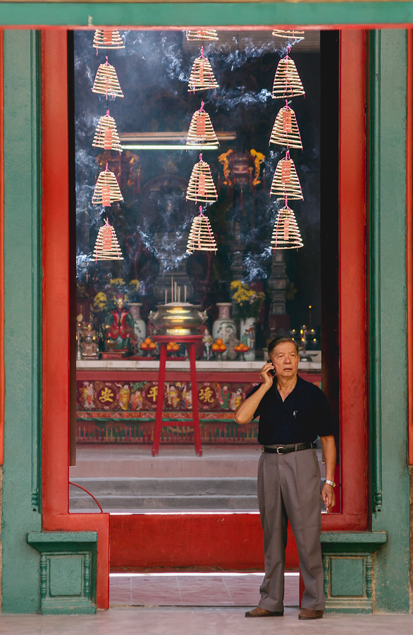 a parte l'uomo che telefona..un gesto ordinario...mi piace l'accostamento cromatico e lo sfondo tutto orientale!!....